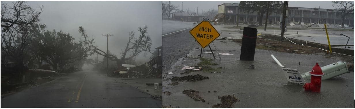 A gauche : Débris au sol après le passage de Delta - A droite : Route inondée et débris au sol après le passage de Delta (Go Nakamura) - AFP