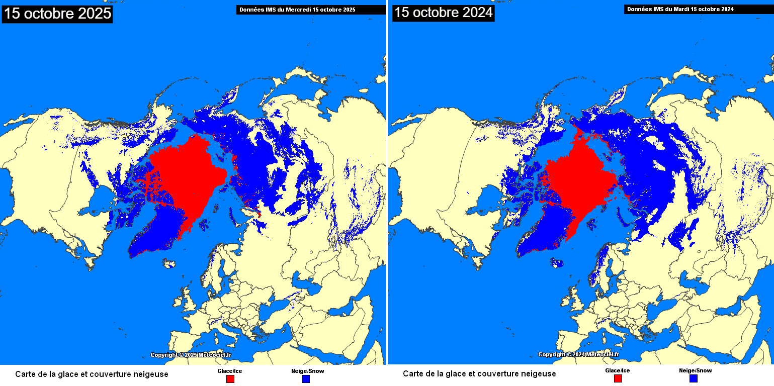 Comparaison de l'étendue de la glace et de la couverture neigeuse sur l'hémisphère nord entre 2024 et 2025 – Via meteociel.fr