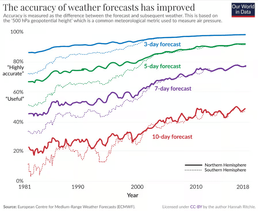 Évolution de la fiabilité des prévisions météo à 3, 5, 7 et 10 jours entre 1981 et 2018 - via Our World in Data