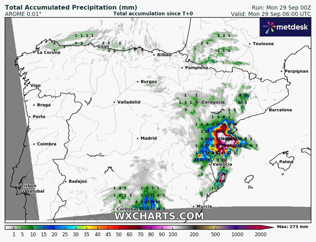Animation des cumuls de précipitations jusqu'au 30 septembre 2025 sur l'Espagne – Modèle arome via WX CHARTS