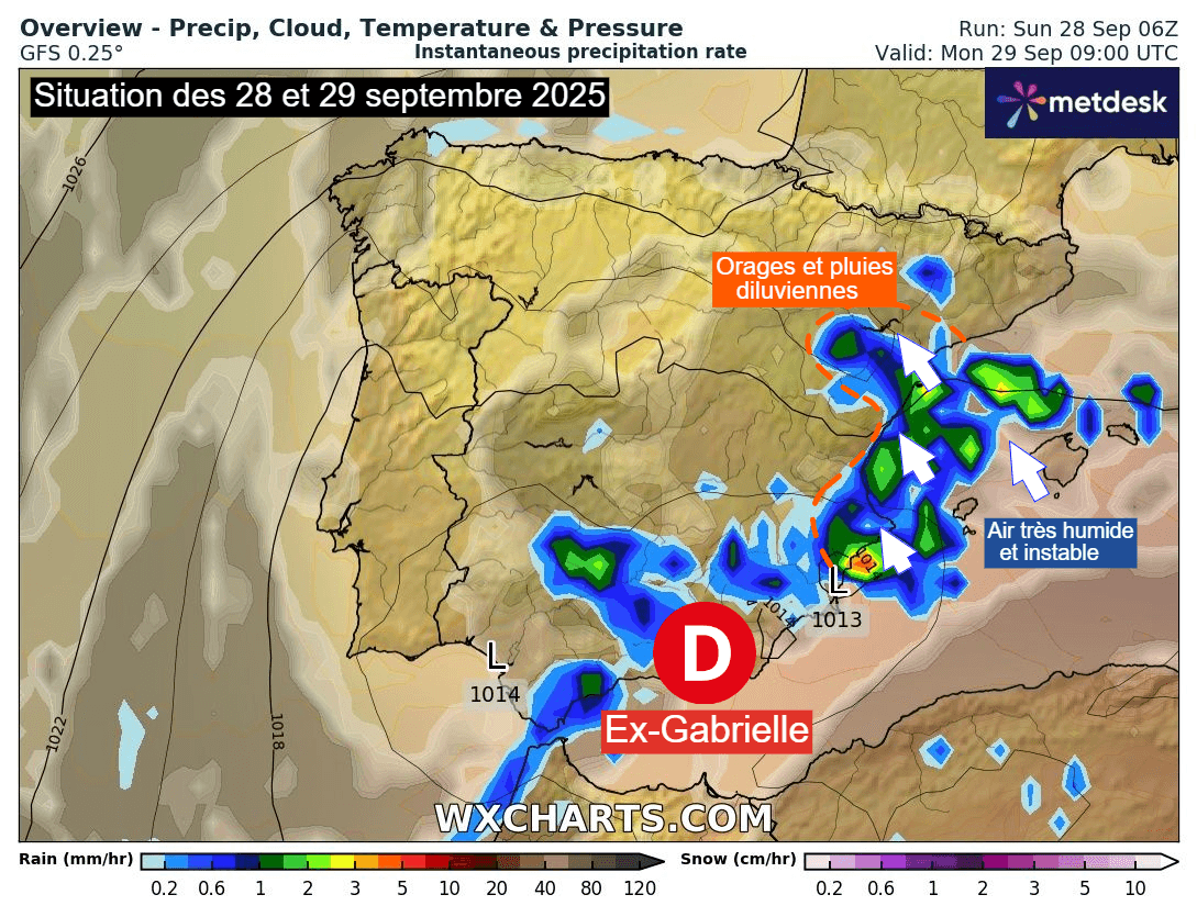 Cette dépression s'est ensuite rapidement comblée à la fin du week-end, s'isolant sur le sud de l'Espagne entre ce dimanche 28 septembre et ce lundi 29 septembre 2025. De ce fait, le flux s'est orienté au sud-est sur la côte est de l'Espagne, apportant de l'air très humide et instable sur ces régions, notamment entre Tarragone et Alicante.