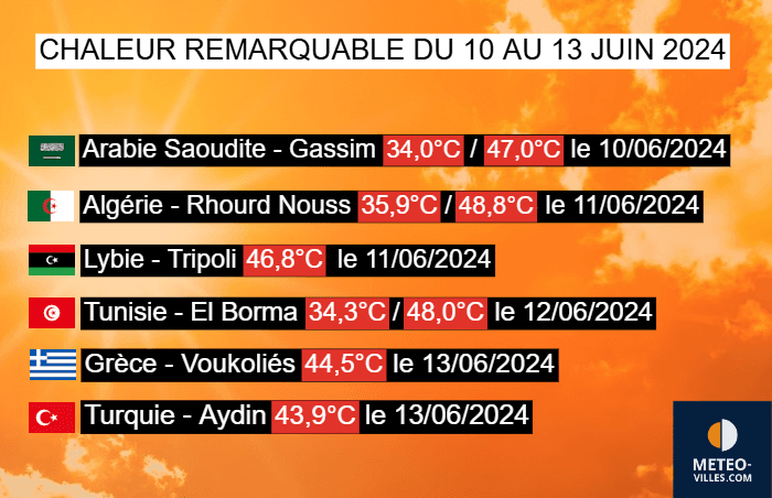 La Grèce est loin d'être la seule à souffrir de ces températures extrêmes. Depuis le début de la semaine, de nombreux records ont été battus dans les pays bordant la Méditerranée, tout particulièrement dans le nord de l'Afrique. En Arabie Saoudite, la station de Gassim a relevé une minimale de 34°C et une maximale de 47°C le 10 juin 2024 ! En Algérie, celle de Rhourd Nouss n'est pas descendu sous 35,9°C et a culminé à 48,8°C le 11 juin ! Le même jour, Tripoli (Libye) enregistrait 46,8°C ! En Tunisie, il n'a pas fait moins de 34,3°C et jusqu'à 48°C à El Borma le 12 juin, battant les records mensuels nocturne et diurne ! Ce 13 juin, le mercure a atteint 43,9°C à Aydin en Turquie.