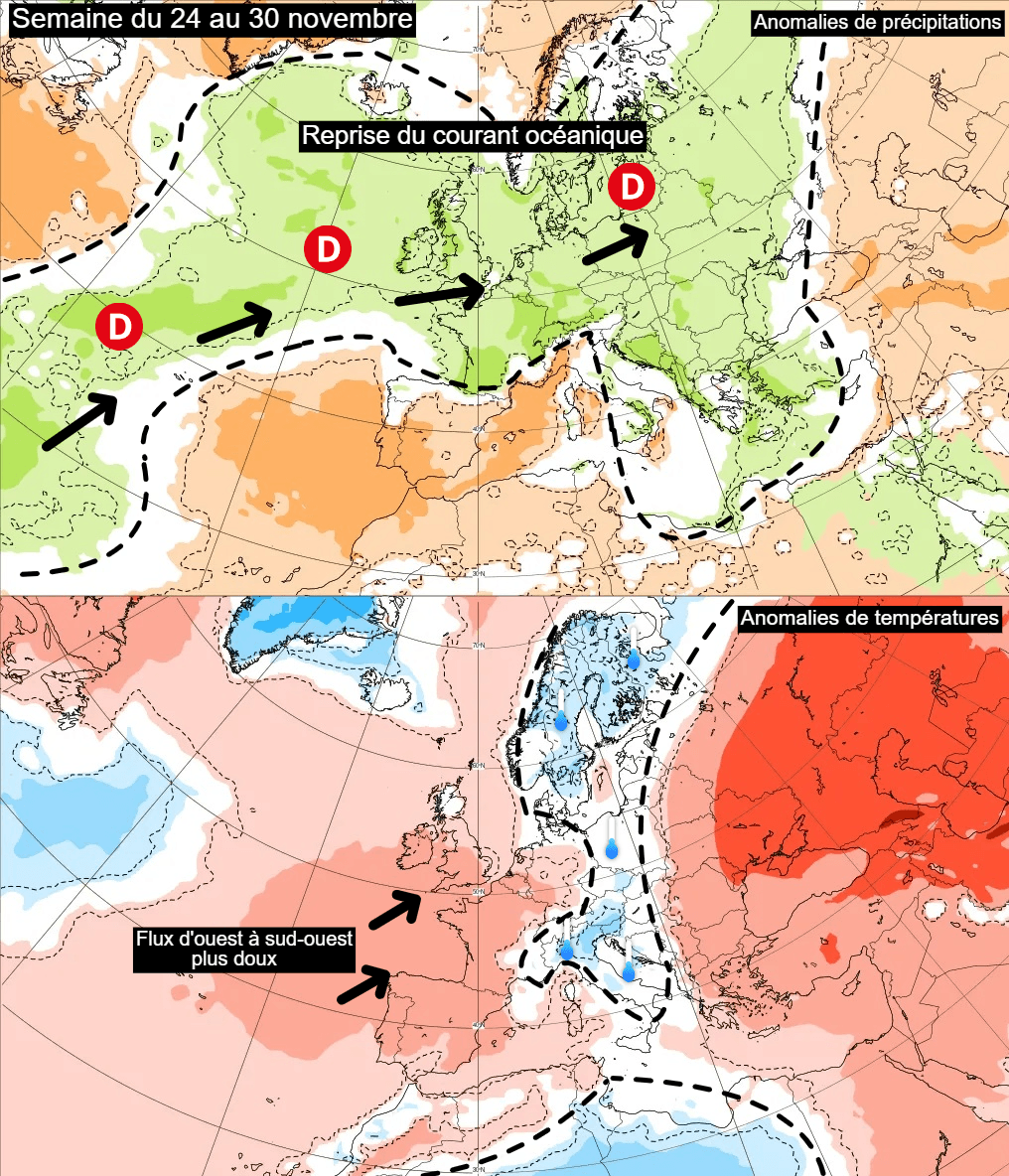 Anomalies de précipitations et de températures sur l'Europe pour la semaine du 24 au 30 novembre 2025 – ECMWF