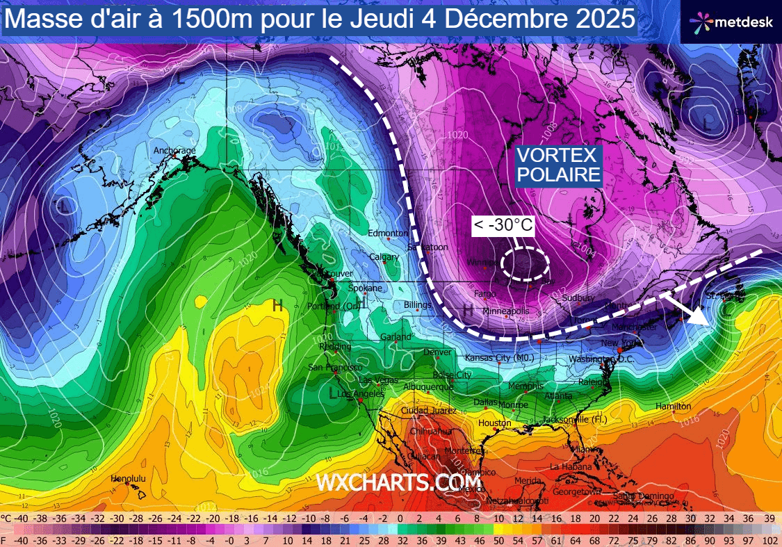 Cela se confirme : le nord de l'Amérique se prépare à l'arrivée d'une partie du vortex polaire la semaine prochaine, pour le début du mois de décembre 2025. En effet, une coulée d'air polaire va plonger sur une partie partie est du Canada et sur les états du nord-est des USA. La masse d'air prévue est loin d'être anodine : le modèle européen envisage des pointes à -30°C à 850 hPa (vers 1500 mètres d'altitude) au dessus de l'Ontario pour le jeudi 4 décembre 2025 ! De telles valeurs sont 15 à 20°C sous les moyennes de saison et sont généralement observées à proximité du pôle.