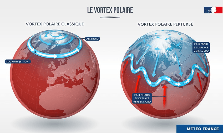 Le vortex polaire, cette vaste zone d'air froid qui circule autour de l'Arctique, est actuellement instable. De ce fait, le courant jet - qui circule d'ouest en est autour de l'hémisphère nord - tend à faiblir et à onduler davantage, ce qui peut entraîner des décrochages d'air polaire en direction des latitudes tempérées. C'est ce qui s'apprête à se produire sur le nord de l'Amérique. Un vortex polaire augmente donc les risques de coulées froides sur l'Amérique mais aussi en Europe, même si le climat plus océanique de l'Europe rend les coulées froides moins intenses qu'au Canada ou aux États-Unis.